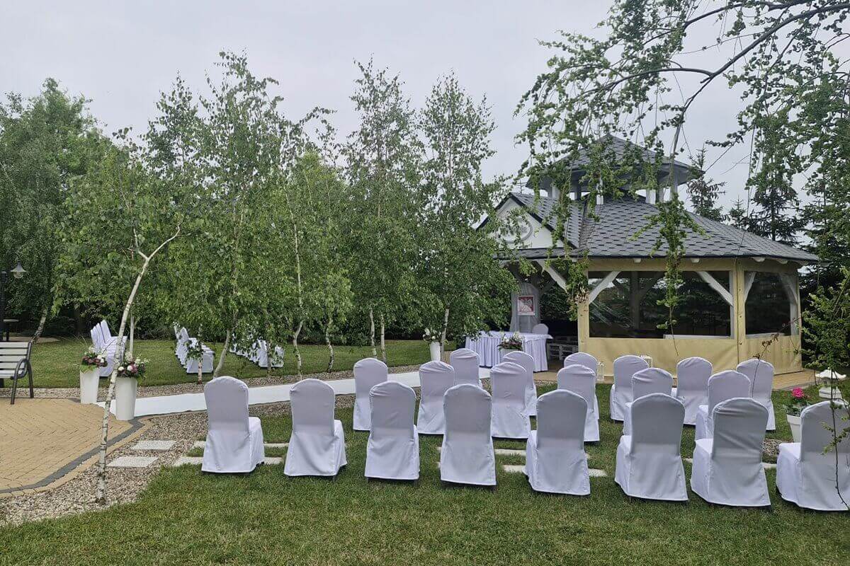 W obecnym sezonie dużą popularnością cieszy się rustykalna elegancja, w której drewniane elementy, suszone kwiaty i ciepłe tkaniny tworzą przytulny, naturalny klimat. Tego typu aranżacje świetnie sprawdzają się zarówno w naszych salach bankietowych, jak i podczas ślubów w plenerze na zielonej przestrzeni wokół obiektu, która doskonale nadaje się na sesje zdjęciowe.